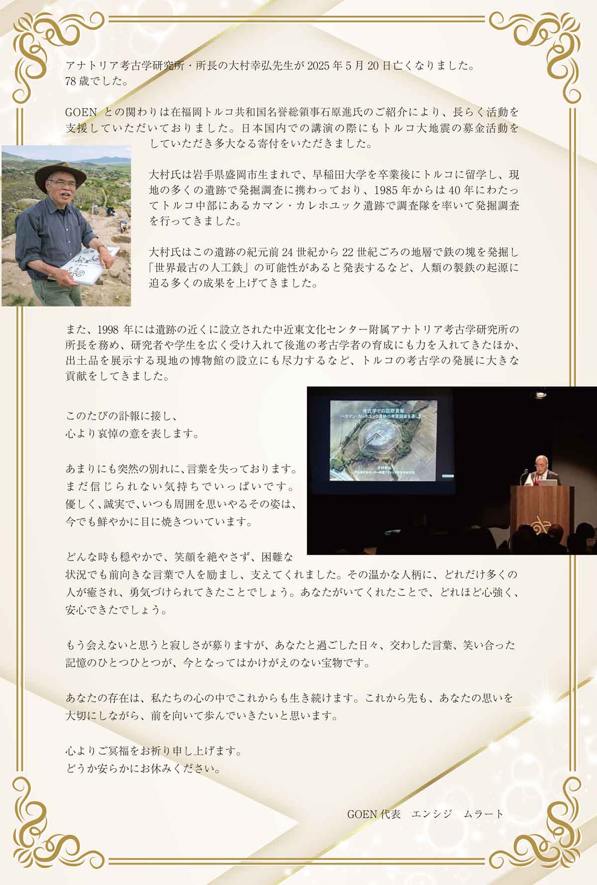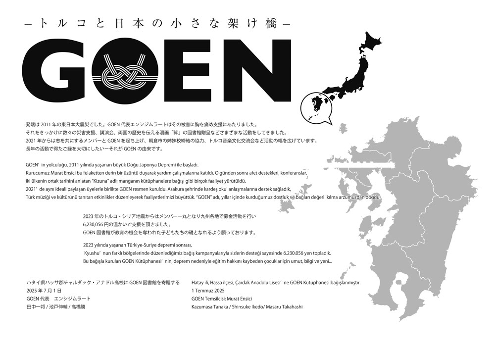 私たち“GOEN”は災害支援だけでなく、朝倉市の姉妹校締結の協力、小中学校での講演会、両国の歴史を伝える漫画“絆”の図書館贈呈、トルコ音楽・文化交流会など、トルコと日本の交友を深める活動を長年続けています。